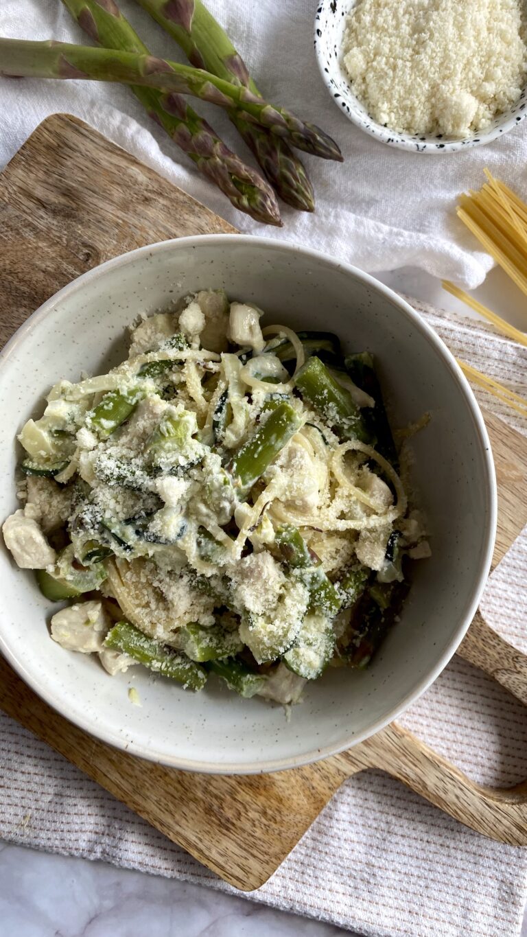 Spaghetti ze szparagami, kurczakiem i cukinią